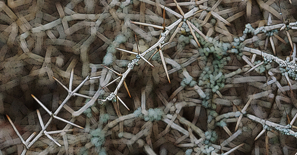 Image of many leafless branches with long, straight thorns or prickles. The focus is on several thin branches in the front, with the rest as a blurred mass behind them. This image is an alteration of a photograph by Kranich17.